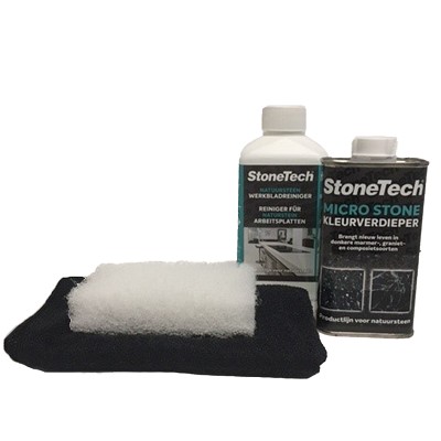 StoneTech Composiet Aanrechtbladen Onderhoud Set: Verfris en bescherm met gemakDe StoneTech Composiet Aanrechtbladen Onderhoud set is ontworpen om moeiteloos vet, was, en vuil te verwijderen van marmer, composiet, graniet, en ander natuursteen. Deze set bestaat uit twee essentiële producten die samenwerken om niet alleen te reinigen, maar ook nieuw leven in te blazen en te beschermen:StoneTech Natuursteen Werkbladreiniger: Verwijdert effectief vet, was en vuil van diverse natuurstenen oppervlakken, waaronder composiet. Dit zorgt voor een frisse start en bereidt het oppervlak voor op verdere behandeling.StoneTech Micro Stone: Een product dat niet alleen nieuw leven brengt in glanzend en gekleurd steen, marmer, graniet en composiet, maar ook doffe en aangetaste plekken camoufleert. Hierdoor verbetert het de algehele glans en kwaliteit van het oppervlak.Gebruiksaanwijzing:Werkbladreiniger Verdunnen: Verdun StoneTech Natuursteen Werkbladreiniger met water (max. 1:10). Reinig het blad met een spons of een witte pad. Laat het even inwerken en neem af met een natte doek. Wacht tot het blad volledig is opgedroogd.Micro Stone Aanbrengen: StoneTech Micro Stone moet handmatig worden aangebracht. Laat het product druppelsgewijs vallen op de horizontale vlakken en wrijf het gelijkmatig in met een zachte witte doek.Droogtijd: Na behandeling moet het oppervlak minstens 24 uur droog blijven om het waterafstotend effect van de actieve silicone te behouden.Een goed alternatief voor StoneTopVerbruik:Verbruik Werkbladreiniger: 10-30 m² per liter.Verbruik Micro Stone: ca. 10-15 m² per liter.Investeer in de langdurige schoonheid en bescherming van je composiet aanrechtbladen met de StoneTech Composiet Aanrechtbladen Onderhoud Set. Eenvoudig in gebruik, groots in resultaat.